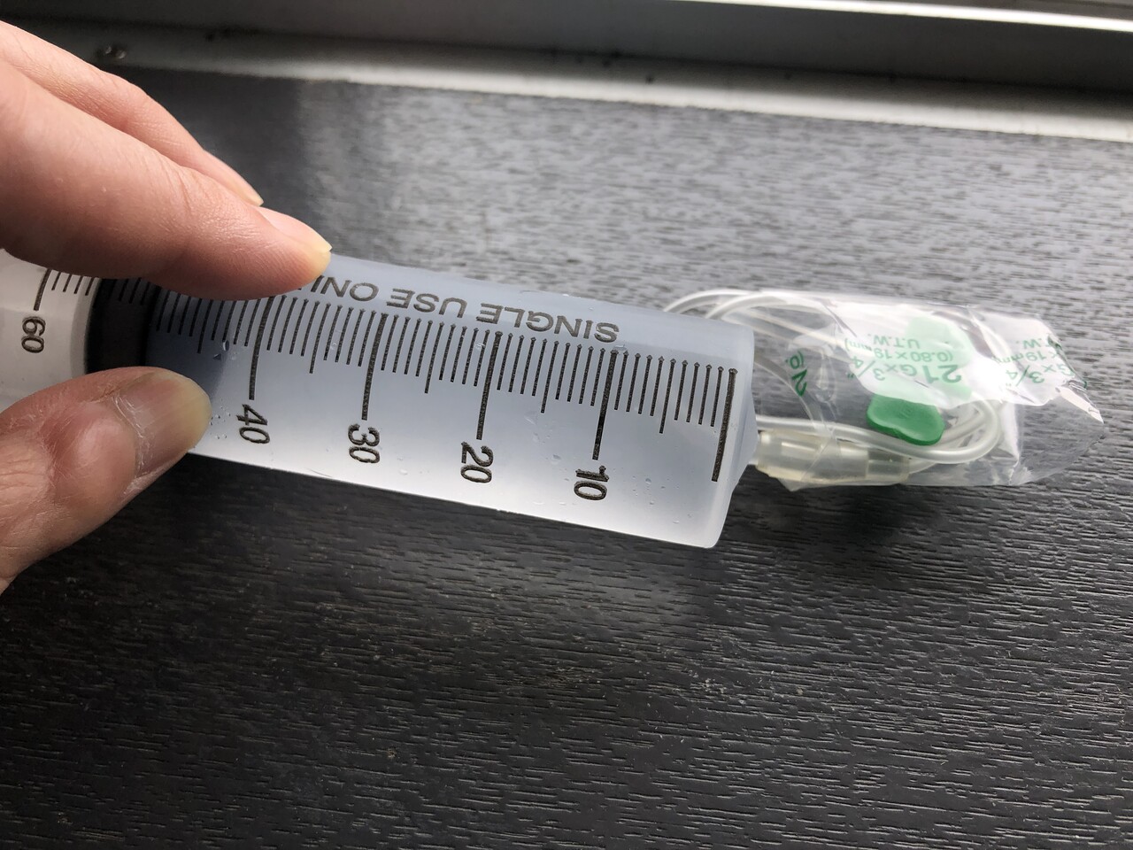 便が出なくなって2週間目あたりから、水も飲まなくなったので、先生に相談して、自宅で輸液することに。一日朝晩2回、各50mℓ。